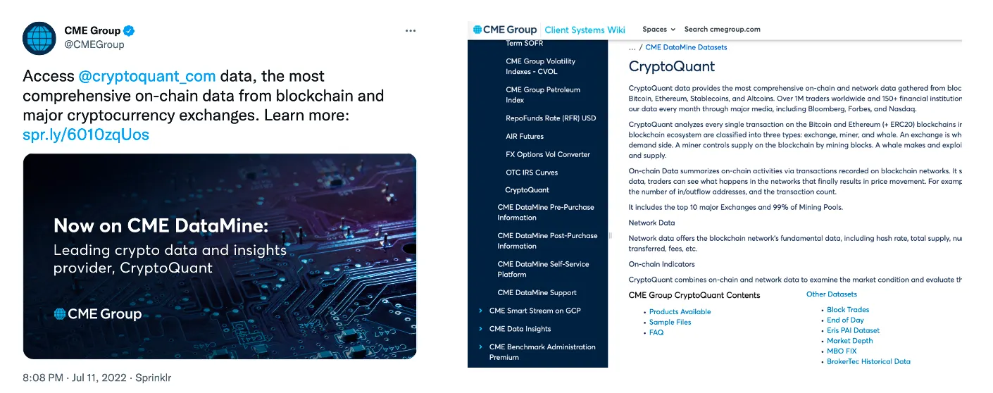 크립토퀀트는 작은 규모의 팀으로 시작했지만, 이제는 전세계 전통 금융 기관들과 블룸버그와 같은 주요 미디어에서 먼저 찾는 서비스로 성장했어요. 2022년 7월에는 세계 1위 선물 거래소 CME에 온체인 데이터 업체 중 최초로 크립토퀀트가 온보딩되었고 올 해 1월에는 미국 신용 평가사 Moody’s에 인사이트 공급 체결 계약을 맺는 등 입지를 굳히고 있습니다.